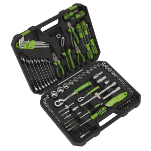 • Features 45-tooth flip reverse comfort grip ratchet wrench with push-button quick release, hex sockets, hex socket bits, extension bars, T-bar, open-end wrenches, pliers, cable knife, voltage tester, nut drivers, screwdrivers and hex keys.