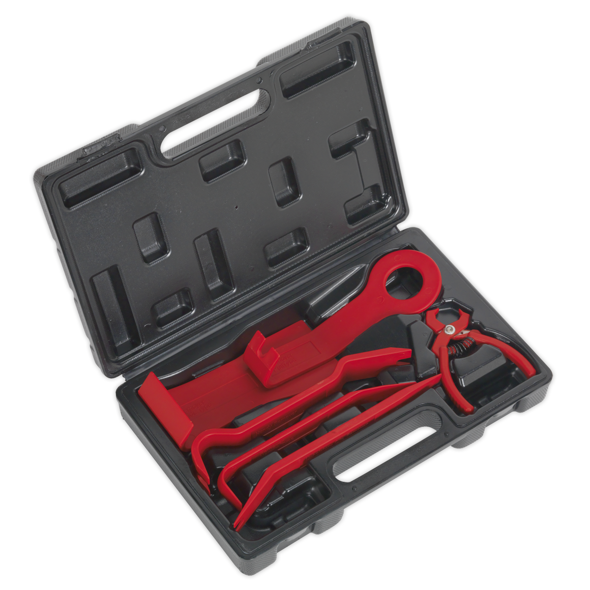 • Includes five trim and upholstery tools, plus trim clip removal pliers with spring loaded handles in storage case.