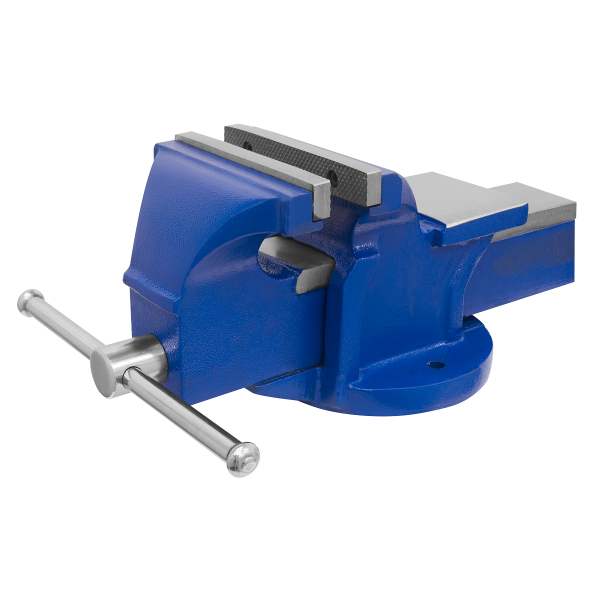 • Bench mounting vice with cast iron body and replaceable, serrated steel jaws.